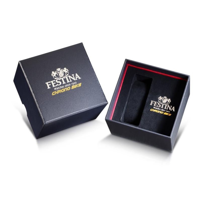 Festina Chrono Bike pre rok 2022 sa pýši novo pojatým puzdrom, tentoraz s jednou korunkou a výraznou lunetou. Oceľové puzdro si zachovalo svoju šírku – 47 mm. Ciferník aj naďalej ponúka pohľad na tri klasické chronografy so stopkami a 24 hodinovým ukazovateľom. Nechýba ani dátumovka. O dobrú čitateľnosť sa starajú výrazné ručičky a indexy s luminiscenciou. Vodotesnosť 10 atmosfér umožňuje bezstarostné plávanie s hodinkami na ruke, kam si ich pripnete ladným oceľovým ťahom.